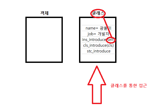 먼저 클래스를 통해 접근했기 때문에 바로 클래스 네임스페이스를 확인한다. 하지만 매개변수가 self (자신 객체를 의미)이기 때문에 객체 내부의 변수들을 호출하는 것이 불가능하다.
