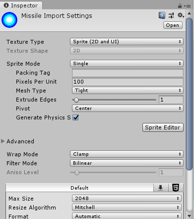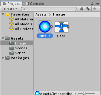 1. 이전에 비행기 Sprite를 만든것 처럼 미사일의 Sprite를 만들어 오브젝트로 저장해줍니다.