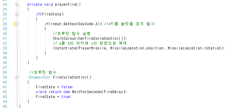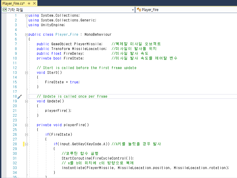 2. 다음으로 미사일을 발사하는 Script 'Player_Fire'를 아래와 같이 작성합니다.