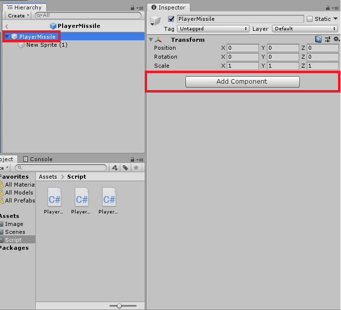 6. 작성한 Script를 기존에 오브젝트화 해놓은 미사일에 추가해준다.