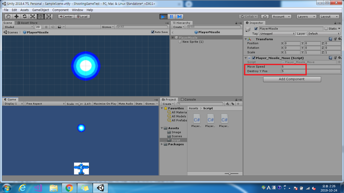 7. 마지막으로 MoveSpeed 와 DestroyYPos 값을 원하는 수치로 설정해준 후 재생버튼을 누르면 미사일이 날라가는 것을 확인 할 수있다.