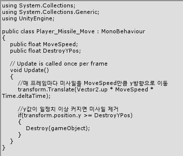 5. 다음으로 미사일이 이동하는 'Player_Missile_Move' Script를 작성한다.